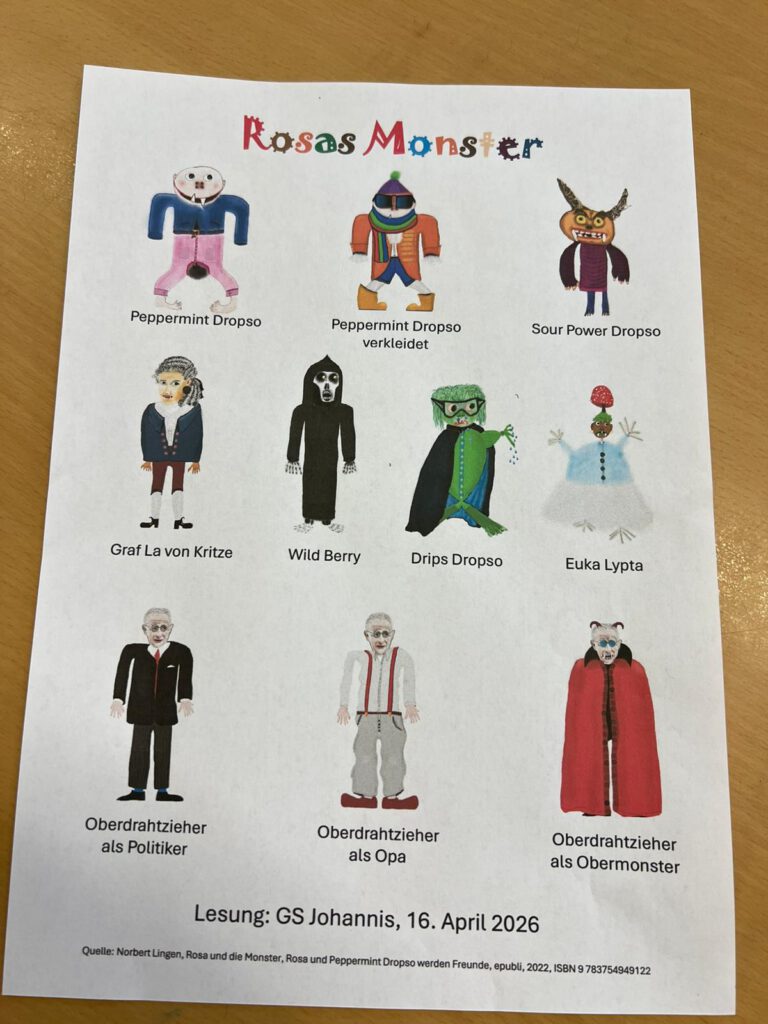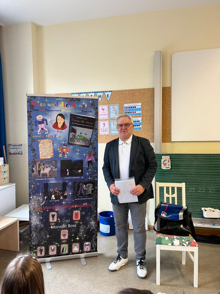 Heute durften wir einen besonderen Gast an unserer Schule begrüßen: Der Autor Norbert Lingen aus Erlangen war zu Besuch in den ersten Klassen. Er stellte sein Buch „Rosa und die Monster“ vor und nahm die Kinder mit auf eine spannende Reise in Rosas Welt.